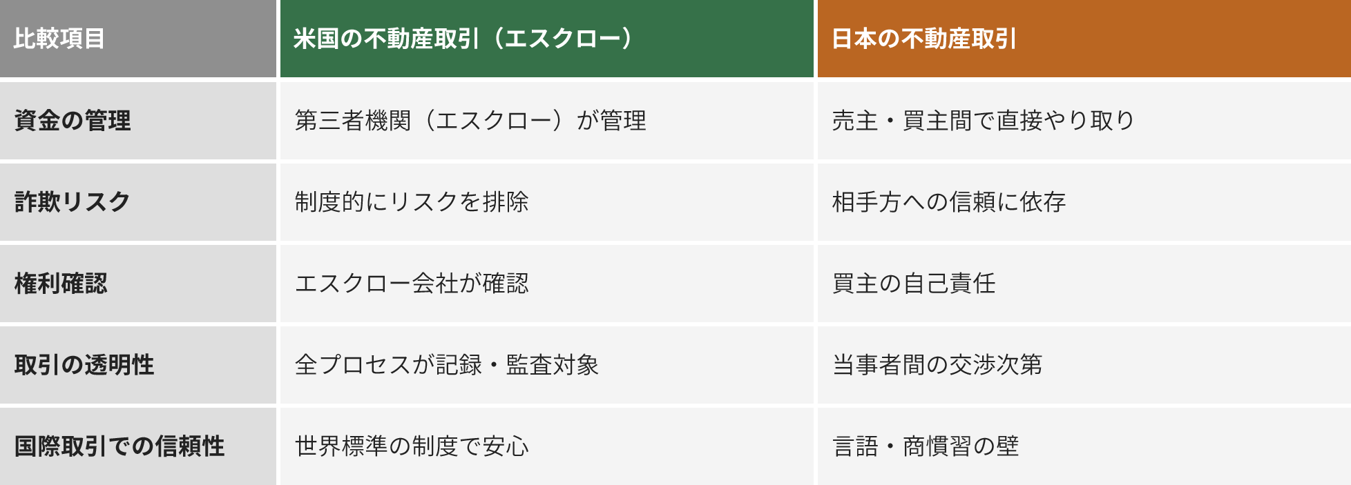 米国不動産取引では、エスクロー(Escrow)という第三者機関による資金保護システムが確立されています。 これにより、お客様の大切な資金は取引完了まで安全に保護され、詐欺や資金の持ち逃げリスクを完全に排除します。