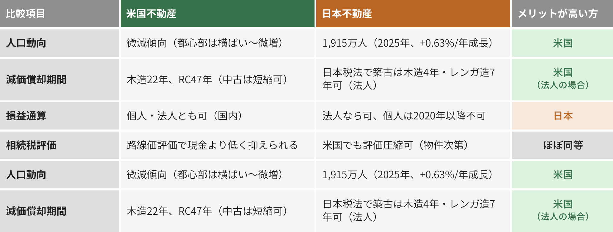 土地の価値が高く建物比率が低い日本不動産と、建物の価値が高く償却対象が大きい米国不動産。